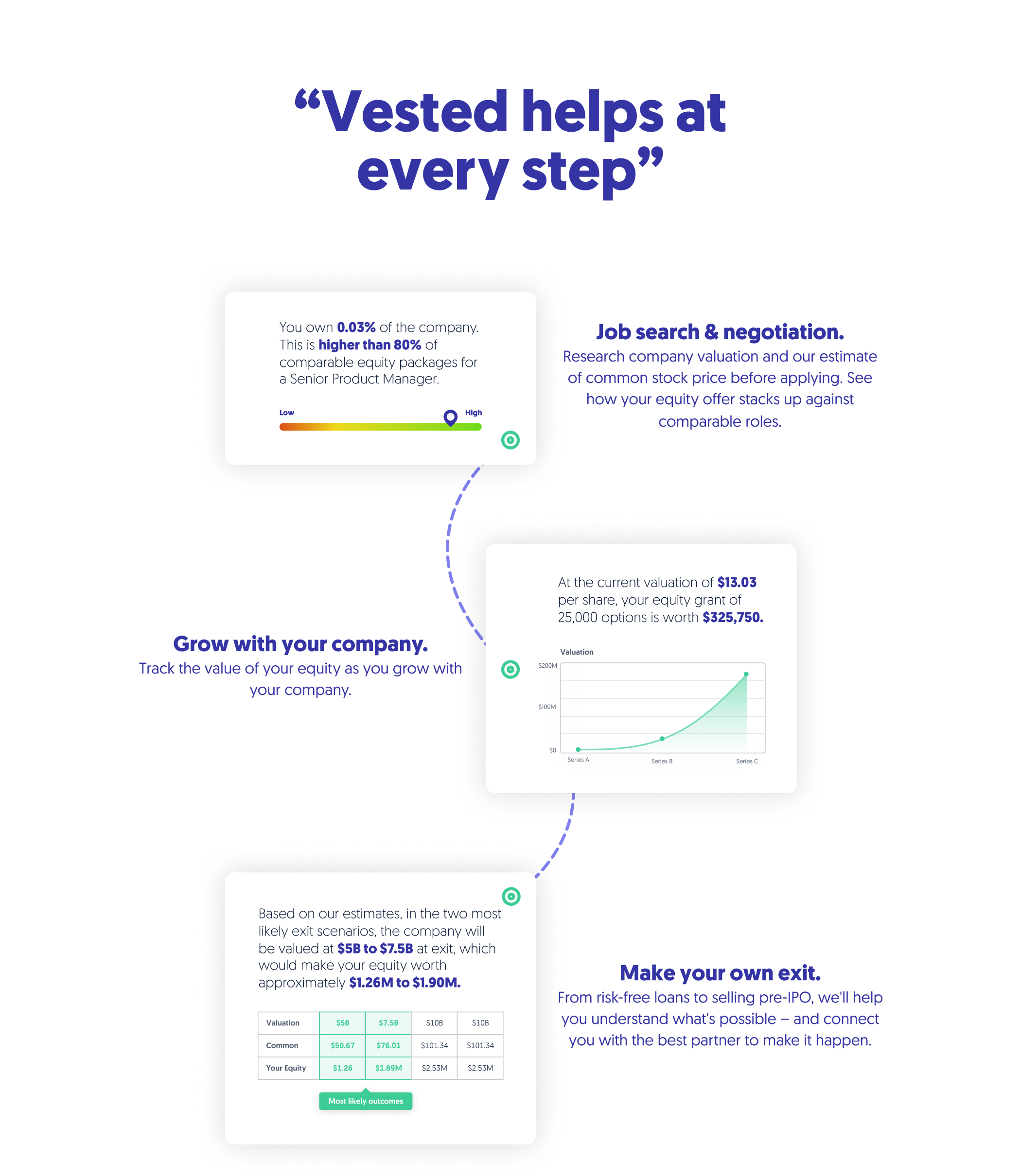 Vested was founded by two alumni from Circle, I joined as the third employee and founding designer. Our mission was to unlock the value of stock option compensation for employees in the tech sector, value that is frequently abandoned by employees who can’t afford to exercise:
